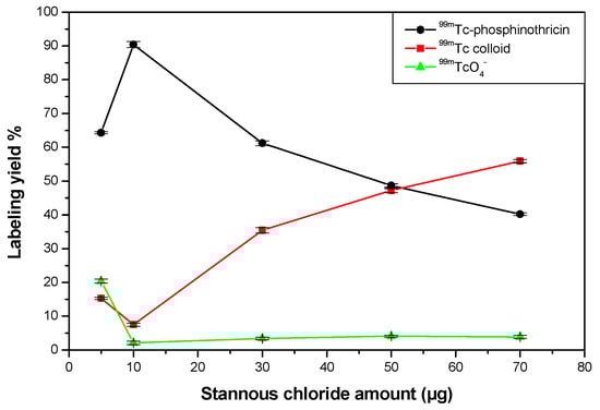 When too much SnCl2·2H2O was added, the labeling yield decreased (40.2% at 70 µg) and the amount of colloid increased. This is because most of phosphinothricin became complexed with 99mTc, so the free 99mTc was reduced to insoluble technetium (IV) TcO2·xH2O in the absence of phosphinothricin [19]. Furthermore, the stannous chloride excess forms stannous hydroxide colloid Sn(OH)3− in the basic medium [20,21].