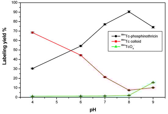 The labeling yield of 99mTc-phosphinothricin increased with increasing pH of the reaction medium (Figure 10). At a pH of 4, the labeling yield was low (30.4%) due to protonation of lone pair carrying oxygen atoms of phosphinothricin, which compete with technetium for binding to the lone pair [22]. The maximum labeling yield (90.4%) was obtained at a pH of 8, at which point phosphinothricin combined with all the reduced technetium [23]. Further increases in pH decreased the labeling yield to 74.1% at a pH of 9. This is because SnCl2·2H2O readily precipitates at high pH values, while this high pH also favors the formation of free 99mTcO4− and insoluble reduced hydrolyzed 99mTc colloid in an alkaline medium [24,25].