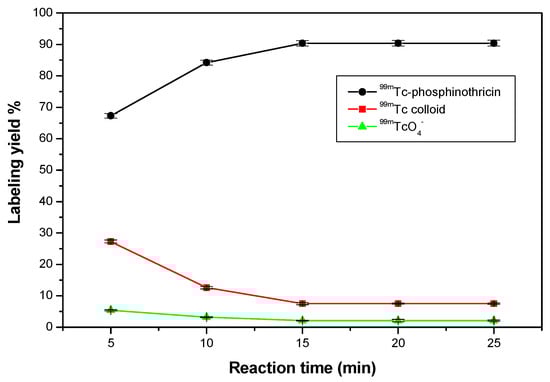 A short reaction time (5 min) was insufficient to form the 99mTc-phosphinothricin complex, which lead to a low labeling yield (67.3%). Increasing the reaction time to 15 min caused an increase in the radiochemical yield to 90.4%, which remained constant with a further increase in the reaction time to 25 min (Figure 11).