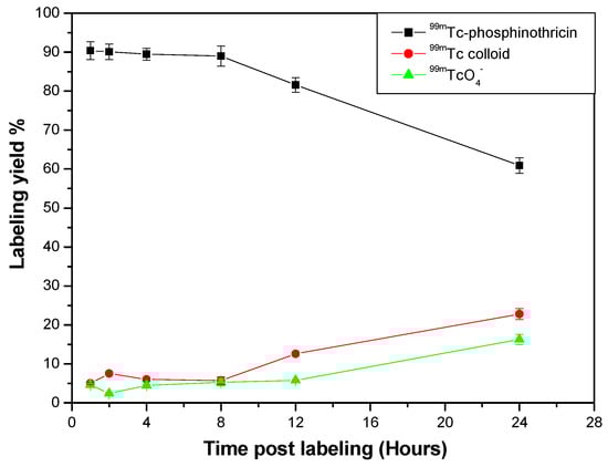 Hydrolysis, oxidation or γ-radiolysis of 99mTc-radiopharmaceuticals may occur during storage. Therefore, in vitro stability of such radiopharmaceutical compounds determines the most suitable time during which the preparation could be used [18]. The 99mTc-phosphinothricin complex showed in vitro stability for more than 8 h after labeling, with a radiochemical yield of 90.4% until 8 h had passed (Figure 12).