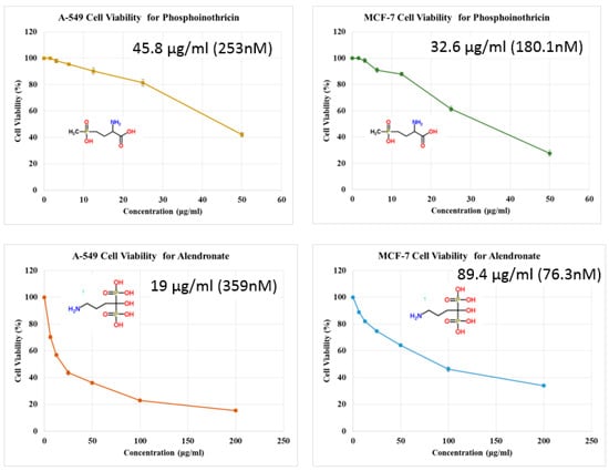 The in vitro cytotoxity of phosphinothricin against the breast cancer cell line MCF-7 showed an IC50 of 32.6 μg/mL, much better than that of alendronate with an IC50 of 89.4 μg/mL. The anti-cancer effect on lung cancer cell line A-549 was reversed, where phosphinothricin had an IC50 of 45.8 μg/mL and alendronate showed an IC50 of 19 μg/mL.