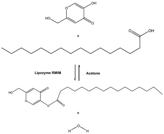 Reaction scheme of kojic acid derivative synthesis from palmitic acid and kojic acid in acetone using Lipozyme RMIM.