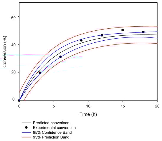 The conversion of KAD synthesized by commercial Lipozyme RMIM increased with increasing reaction time (from 0 to 12 h) and the proposed model of fitness, Equation (4) (in the section of materials and methods). A good agreement between experimental and predicted conversion was observed (Figure 2) with kinetic parameters summarized in Table 1. The predicted yield fitted well with the experimental value and the statistical analysis indicated that the deviations were not significant at a probability of 0.05. The conversion (%) of KAD had increased within the first 12 h and a maximum value of 49.1% was observed before equilibrium. This further suggests that time course can pinpoint the adequate time period necessary to obtain suitable conversion and yields. During esterification, forward reaction was greater than reverse reaction until equilibrium. At equilibrium, the rate of the forward reaction was seen equal to the rate of the reverse reaction while the concentrations of substrates (palmitic acid and kojic acid) and products (KAD) had changed. The decrease in conversion may be due to lipase desorption during operation, which in return decreases the enzyme activity. Many substrates/products of lipases have some detergent character (free fatty acids) and may facilitate undesired lipase desorption during operation [26,27]. In order to improve the performance of KAD synthesis, polyethylenimine (PEI), specific encapsulant and cryoprotectant may be considered to modify enzymes as it might improve many enzyme properties such as stabilization versus organic solvents or oxygen, radical scavengers, heat and stabilization of multimeric structures [28,29].