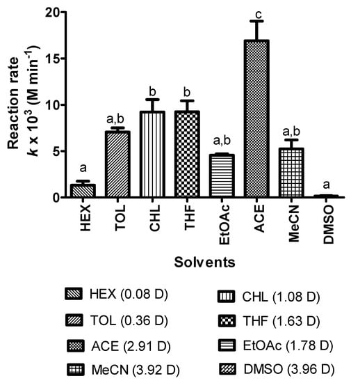 The rate of reaction of KAD synthesis in organic solvents with various dipole moments (D) where the reaction time, temperature, substrate molar ratio, agitation and enzyme loading were fixed at 12 h, 50 °C, 5:1, 180 rpm and 1.25% (v/v), respectively. Letters a, b, and c indicate significant difference at p <0.05 with Bonferroni’s multiple comparison test. Note: HEX: Hexane; TOL: Toluene; CHL: Chloroform; THF: Tetrahydrofuran; EtOAc: Ethyl acetate; ACE: Acetone; MeCN: Acetonitrile; DMSO: Dimethyl sulfoxide.