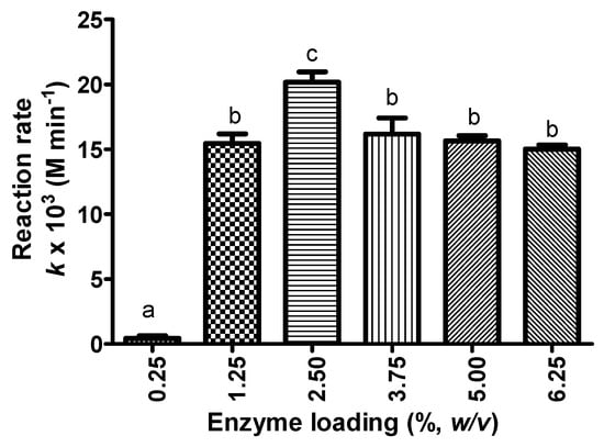 The rate of reaction of KAD synthesis in acetone using different enzyme loading (%, w/v) where reaction time, temperature, agitation, and substrate molar ratio were fixed at 12 h, 50 °C, 180 rpm and 5:1 (fatty acid:kojic acid), respectively. Letters a, b and c indicate significant difference at p < 0.05 with Bonferroni’s multiple comparison test.