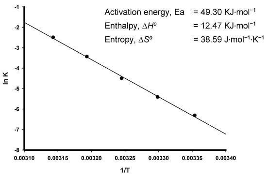 The Ea of the reaction was calculated from the Arrhenius equation, where reaction rate is proportional to the Ea (Equation (6)). Arrhenius equation is a formula for the temperature dependence of the rate constant, and thus rate of reaction. Additionally, the thermodynamic parameters of the reaction were estimated using the Van’t Hoff equation (Equation (7)). The Van’t Hoff equation describes the temperature dependence of the equilibrium constant assuming that the enthalpy of the reaction is constant as the function of temperature.
