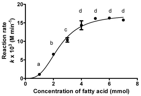 The rate of reaction was gradually increased with increasing fatty acid concentration where kojic acid concentration was kept constant (Figure 7). Fatty acid is a suitable limiting substrate due to its ability to solidify at low temperature, low cost and to be easily removed during the purification process as compared to kojic acid [7]. The ratio of 5:1 palmitic acid to kojic acid was the optimal molar ratio that resulted in the highest reaction rate of 16.11 × 10−3 M·min−1, whereas higher fatty acid concentration (more than 5 mmol) showed a slight decreased. Increasing palmitic acid concentration beyond this point may not only provide excess palmitic acid, but also hinder the rate of reaction between enzyme and substrates. In addition, the high palmitic acid concentration has caused an increase in viscosity of the liquid phase that consequently reduced the degree of mixing, which may eventually introduce potential trouble to the downstream and purification processes. Even though higher concentrations of acyl donor are usually preferred for esterification in an organic solvent [45], it is also well known that high amounts of acid can disturb the microenvironment around the enzyme as the acids exhibit inhibitory action, thus decreasing the rate of the reaction [46,47,48]. Very high fatty acids in the reaction system could result in more fatty acids partitioning into the surrounding water shell and limit the access of substrates into the interface, hence reducing substrate-enzyme binding [48]. Previous studie have shown that the esterification rate of wax ester catalyzed by Lipozyme RMIM decreased at high hexanoic acid and octanoic acid concentrations [17,43]. Besides, it was reported that a competitive enzyme inhibition by butyric acid during esterification reactions by Rhizomucor miehei lipase led to the decrease in reaction rate [17,19]. Another study has reported that the esterification reaction by Lipozyme RMIM was also a substrate inhibited by lauric acid at some concentration [23].
