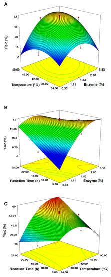 Surface plot; (A) Reaction temperature and amount of enzyme (X2X3) against yield (substrate ratio 5:1; reaction time 15 h); (B) Reaction time and amount of enzyme (X2X4) against yield (substrate ratio 5:1; temperature 42 °C); and (C) Reaction time and reaction temperature (X3X4) against yield (substrate ratio 5:1; amount of enzyme 1.83%, w/v).