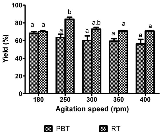 Effect of agitation speed on the percentage yield of kojic acid palmitate by using different impeller designs in a 0.5-L stirred-tank reactor. (Working volume: 0.2 L, substrate ratio: 6.74, enzyme loading: 1.96% (w/v), reaction temperature: 45.9 °C, reaction time: 20 h). Letters a and b indicate significant difference at p <0.05 with Bonferroni’s multiple comparison test. RT: Rushton turbine; PBT: pitch-blade turbine.