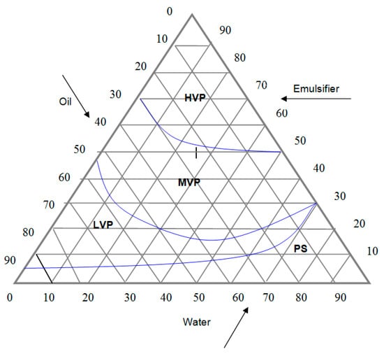A standard phase diagram of formulation using difference percentage (w/w) of palm oil, emulsifier and distilled water. HVP: High viscous phase; MVP: Medium viscous phase; LVP: Low viscous phase; PS: Phase separation.