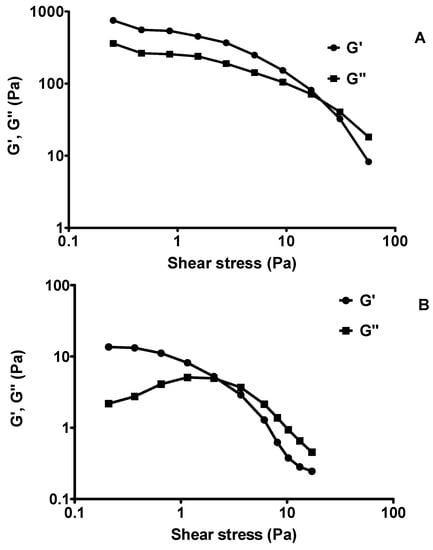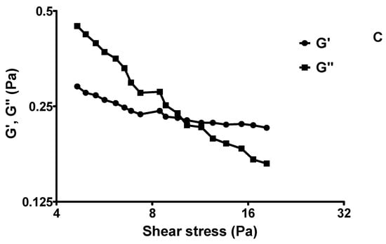 Then, the samples were tested for amplitude sweep where the amplitude of the shear stress was varied, and the frequency was kept constant. The storage modulus (G′) and the loss modulus (G″) were plotted against the amplitude of the shear stress.