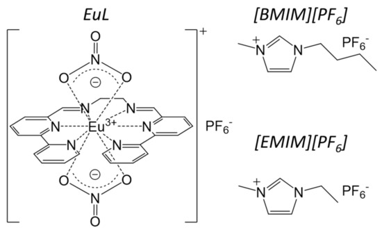 The following are available online. Figure S1: Luminescence decay curves of EuL in [BMIM][PF6] and acetonitrile; Figure S2: Excitation spectra of EuL in [BMIM][PF6] and in acetonitrile; Figure S3: Electronic absorption, emission spectra, and decay curves of EuL in [BMIM][PF6]/acetonitrile; Figure S4: Projection views of a [EMIM][PF6] single crystal.