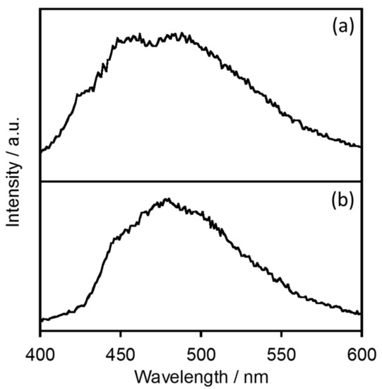 In the case of EuL, the triplet state of the ligand functions as the energy donor to the Eu3+ ion [4]. The energy donor level in [BMIM][PF6] was estimated by acquiring phosphorescence spectra of a gadolinium complex with L (abbreviated as GdL) at 77 K (Figure 4). GdL generates a phosphorescence band at approximately 460 nm in both [BMIM][PF6] and the rigid solvent ethanol, as shown in Figure 4.