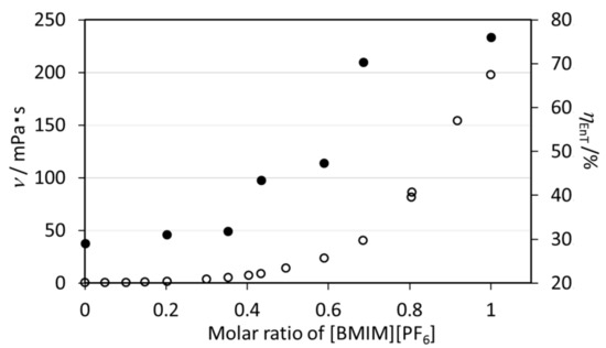 ηEnT (filled circles) and ν (open circles) as functions of the [BMIM][PF6] mole fraction.