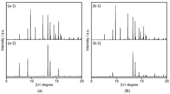 Synchrotron X-ray powder diffraction patterns of (a) [EMIM][PF6] and (b) EuL in [EMIM][PF6]. (a-1,b-1) before and (a-2,b-2) after heating at 70 °C (λ = 1.017593 Å).
