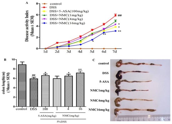 The colon length also indirectly indicated the severity of DSS-induced colitis. DSS typically causes colonic shortening. Such a change was evidently improved by the administration of 4 and 16 mg/kg NMC and 100 mg/kg 5-ASA (Figure 2B,C). However, no significant difference was observed after NMC treatment (1 mg/kg; p > 0.05).