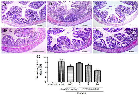 Effects of NMC on histological changes of colonic tissue in DSS-induced mouse colitis. Section were stained with hematoxylin and eosin: (A) control; (B) DSS; (C) 5-ASA (100 mg/kg); (D) NMC (1 mg/kg); (E) NMC (4 mg/kg); (F) NMC (16 mg/kg); (G) histological scores. Data are expressed as mean (n = 10 per group) ± SEM. ## p < 0.01 compared with control group; * p < 0.05, ** p < 0.01 compared with the DSS-vehicle group.