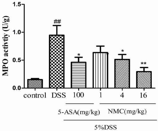 MPO is an enzyme present in neutrophils and at a much lower concentration inmonocytes and macrophages. The level of MPO activity can positively reflect the number of neutrophils [20,21]. As indicated in Figure 4, MPO activity of the mice with DSS-induced colitis significantly increased compared with that of the untreated DSS mice (p < 0.01). The administration of different doses of NMC (4 and 16 mg/kg) evidently reduced MPO activity in comparison with the administration of DSS. This finding was consistent with the result of 5-ASA treatment. Nevertheless, no statistically significant differences were observed between the NMC (1 mg/kg) and DSS groups (p > 0.05).