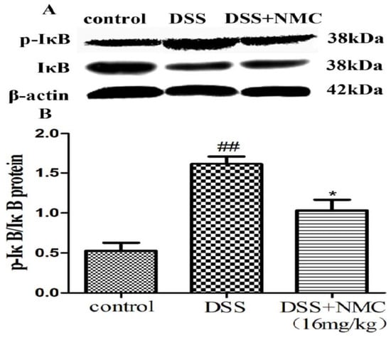 NF-κB, a pivotal transcription factor, regulates the expression of pro-inflammatory genes, which plays an important role in the progression of IBD [22]. Western blot was employed to further determine whether the anti-inflammatory effect of NMC on the expression of pro-inflammatory mediators is correlated with the blockade of NF-κB activation in colonic tissues. We found that the protein expression of IκB decreased but that of p-NF-κB p65, p-IκB and p-IKK increased in the DSS-induced group compared with the control. NMC treatment significantly increased IκB expression, decreased the expression of IκB and IKK phosphorylation and inhibited p-NF-κB p65 expression (Figure 6, Figure 7 and Figure 8).