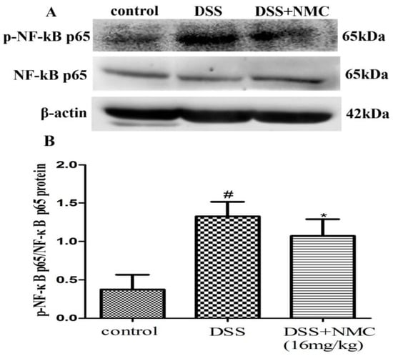 Effects of NMC on the expression of p-NF-kB p65 and NF-kB p65 in DSS-induced colitis. (A) The expression of p-NF-kB p65 and NF-kB p65 in colon tissue were determined using Western blotting. (B) The relative quantification of p-NF-kB p65 and NF-kB p65 protein expression calculated by using Image J software. Data are expressed as mean (n = 10 per group) ± SEM. # p < 0.05 compared with control group; * p < 0.05 compared with the DSS-vehicle group.