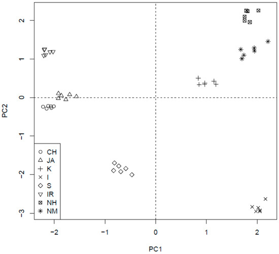 The first principal component (PC1) explained the 45.2% of the total variance, connected with antioxidant activity. GA, TPC, and DPPH are strictly correlated with themselves; therefore, samples lying on the right side of score plot are characterized by the highest antioxidant activity (I, NM, and NH). The samples located on the left side (low PC1 value) are characterized by lowest antioxidant activity (CH, JA, and IR).