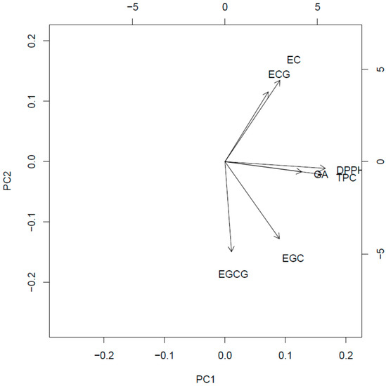 The second principal component (PC2) explains 35.3% of the samples’ variance. It represents the (independent to PC1) trend, connected with changes in EC, ECG, EGC, and EGCG content. The loading vectors of these compounds are located along the vertical axis. It means that they are almost uncorrelated with DPPH, GA, and TPC. EC and ECG are strictly correlated between themselves and they are visibly negatively correlated with EGCG and EGC, which form the second intercorrelated group. Therefore, a high PC2 value means high content of ECG and EC with simultaneous low content of EGCG and EGC (for example IR, NM, and NH). The low PC2 value indicates an opposite behavior (high EGCG and EGC with low ECG and EC, for example I and S).