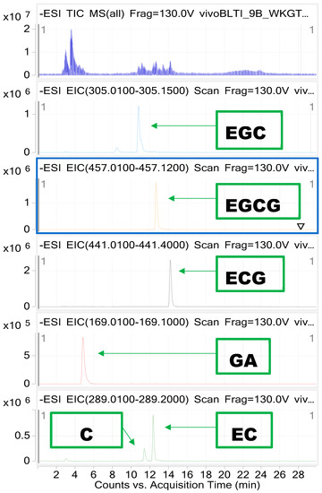 Identification of each catechin was performed based on their retention times and mass spectra (see Figure 1 and Figure S1 in the Supplementary Material). The standards of all catechins and gallic acid (GA) were used in the concentration of 2 mg/mL (stock solution) and then several dilutions (to calculate a 5-point calibration curve) were performed to plot the calibration curves for each compound and characterized the method (calculation of limit of detection (LOD), limit of quantitation (LOQ) values and linearity of the method). The LOQ was determined as a triple value of the obtained LOD, which was calculated as 3 times the signal-to-noise ratio (S/N ratio) value. Results of quantitative analysis of all obtained extracts were evaluated based on the calibration curve equations for each catechin and GA. Table 4 presents the parameters of the method and Figure 3 presents the chromatograms.