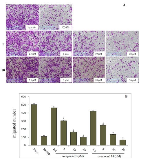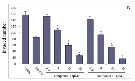 The migration assay, which was used to screen the active compounds from the target products, was performed using a 24-well cell culture plate with 8.0 μm pore size membrane inserts without matrigel. First, 5 × 104 SMMC7721 cells were added to the upper wells, and the chambers were incubated for 24 h at 37 °C. The lower chamber was filled with 800 μL of 10% FBS as a chemoattractant. After 24 h under normoxic conditions, the cells that had migrated were stained (Crystal Violet) and photographed under a light microscope at 200× magnification. The number of migratory cells was then counted and analyzed to determine statistically significant differences. Each condition was assayed in triplicate, the experiments were performed independently at least three times, and the results were expressed as the number of cells/field. One-way analysis of variance was used to determine significant differences. The assay described here was also used to determine the influence of the compounds 1 and 10 at different concentrations on the migration of SMMC7721 cells.
