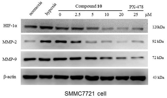 The SMMC7721 cells were plated in a 6-well culture plate at a density of 5 × 105 cells per well. After incubation with drugs, the cells were lysed with SDS buffer containing 200 mM Tris (pH 6.8), 40% glycerol, and 10% mercaptoethanol. The protein (30 μg) obtained from cell extracts was separated using 10–15% SDS/polyacrylamide gel electrophoresis, and then transferred to a polyvinylidene difluoride (PVDF) membrane. Membranes were blocked with 10% skimmed milk in Tris-buffered saline containing 0.1% Tween-20 (TBST) for 1 h at room temperature, and then incubated overnight at 4 °C with respective primary antibodies [anti-HIF-1α (Epitomics, Burlingame, CA, USA), anti-MMP-2 (Santa Cruz Biotechnology Inc., Santa Cruz, CA, USA), anti-MMP-9 (Santa Cruz Biotechnology Inc., Santa Cruz, CA, USA), and anti-β-actin (Santa Cruz Biotechnology Inc., Santa Cruz, CA, USA)] diluted to 1:1000–2000 in TBST containing 5% skimmed milk. After washing three times with TBST, the membranes were incubated with horseradish peroxidase- conjugated anti-rabbit and anti-mouse serum, which were used as secondary antibodies (diluted 1:10,000 in TBST containing 5% skimmed milk) for 1 h at room temperature. After incubation, the antigen–antibody complexes were visualized using the ECL kit and β-actin was analyzed as a loading control.
