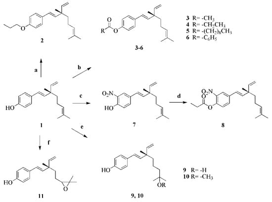 3.7. Synthesis of (S,E)-4-(7-hydroxy-3,7-dimethyl-3-vinyloct-1-en-1-yl)phenol (9) and (S,E)-4-(7-methoxy-3,7-dimethyl-3-vinyloct-1-en-1-yl)phenol (10)