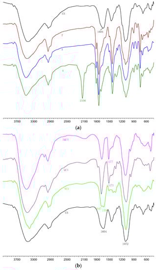 (a) FTIR spectra of the chitosan (CS), phthaloylation of chitosan (2), 6-bromo-6-deoxy-N-phthaloyl-chitosan (3), 6-azido-6-deoxy-N-phthaloyl-chitosan (4). (b) IR spectra of the chitosan (CS), 6-amino-6-deoxychitosan (NCS), N-quaternized chitosan (QCS), and N-diquaternized chitosan (DQCS).