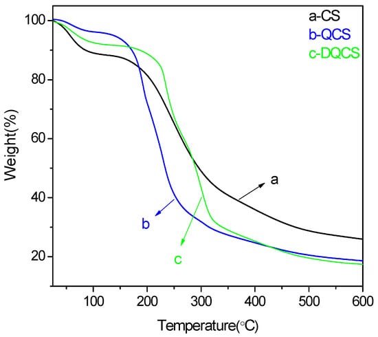 In this study, the weight loss of CS, QCS, and DQCS was 73.9%, 81.8%, and 82.1%, respectively. This poor thermal stability of chitosan derivatives suggested that the groups of quaternized salts resulted in the breakage of the hydrogen bond of CS. It was found that increasing the number of substituted groups would reduce the thermal stability of the sample, which is consistent with previous reports [9].