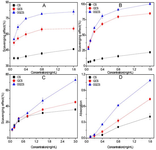DPPH is a useful reagent for investigating the free radical-scavenging activity of compounds. This method is based on the reduction of alcoholic DPPH solution in the presence of an antioxidant into non-radical DPPH-H, and the reduction in color is monitored over time [29]. The scavenging property of CS, QCS, and DQCS against DPPH-radical at various concentrations is showed in Figure 5A. The scavenging effect increased as the concentration of the polymer samples increased to a certain extent, and then levelled off with an even further increase in the concentration. The scavenging ability against DPPH-radical was in the order of DQCS > QCS > CS in the tested concentration range. The results showed that DQCS and QCS exhibited remarkable improvement on DPPH-radical scavenging activity; the scavenging effect were 81.2% and 65.3% at 1.6 mg/mL, respectively. By contrast, the scavenging effect of CS was only 37.4%. Meanwhile, the 50% inhibition concentration (IC50) values of samples were also calculated to assess their antioxidant property. A lower IC50 value indicates greater antioxidant activity (Table 1). This result showed that both DQCS and QCS had the highest activity upon the elimination of DPPH-radical compared to CS. The IC50 of DQCS and QCS was 0.05 mg/mL.