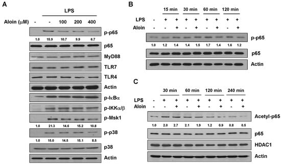 2.5. Aloin Inhibits LPS-Induced p65 Phosphorylation and Acetylation