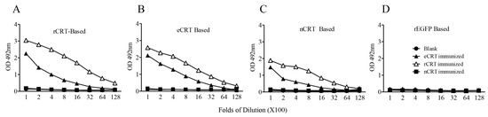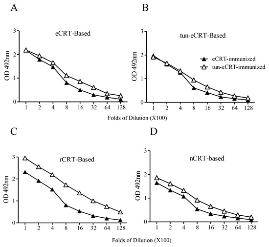 Comparison of immunogenicity of eCRT and tun-eCRT. Coomassie-blue stained SDS-PAGE gel slices containing eCRT or tun-eCRT were used immunogens for s.c. immunization of C57/BL6 mice (n = 5). Immunized mice were boosted with the same antigens with fortnight intervals. Mice were bled 10 days thereafter for detection of antigen-specific IgG in ELISAs based on eCRT (A), tun-eCRT (B), rCRT (C) or nCRT (D). Results are expressed as mean ± SD of three replicates. These are representatives of 3 independent experiments.