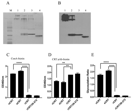 Biochemical properties of eCRT and rCRT. Samples of rCRT/39-272, rCRT, eCRT and nCRT (lanes 1–4, respectively) were compared in Coomassie brilliant blue-stained native PAGE (A), followed by WB using rabbit anti-CRT polyclonal antibody for detection (B). The secondary Ab was HRP labeled goat-anti-rabbit IgG, with OPD as substrate. ELISA plates were pre-coated with nCRT, eCRT, rCRT or rCRT/39-272 followed by ELISAs using ConA-biotin (C) or biotin-conjugated mouse anti-CRT polyclonal antibody (D) for detection. The glycosylation ratios of the CRT preparations were calculated as ODConA/ODpAb (E). Results are expressed as mean ± SD of three replicates. **** p < 0.0001; ** p < 0.01. These are representatives of 3 independent experiments.