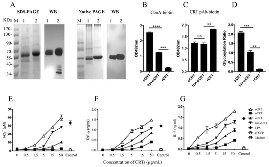 The effect of de-glycosylation on the immune-stimulatory effect of eCRT. Confluent CHO-CRT cells were cultured in serum-free medium in the presence of 5 µg/mL tunicamycin for 48 h. The supernatant was then harvested for purification of tun-eCRT using Ni-columns. Samples of tun-eCRT (lane 1) and eCRT (lane 2) were separated by SDS-PAGE or native PAGE and detected by WB using rabbit anti-CRT polyclonal antibody (A). The glycosylation levels of eCRT, tun-eCRT and rCRT were compared in biotin-ConA binding assays (B) with CRT-Based ELISAs as even protein coating control (C). The glycosylation ratios of the CRT preparations were determined by ODConA/ODpAb (D). Mouse peritoneal macrophages were stimulated with increasing concentrations of eCRT, tun-eCRT, nCRT or rCRT for 24 h, NO (E), TNF-α (F) and IL-6 (G) in the culture supernatant were quantitated by Griess Reagent and ELISAs, respectively. Results are expressed as mean ± SD of three replicates. **** p < 0.0001;*** p < 0.001; ** p < 0.01. These are representatives of three independent experiments.