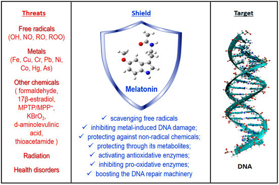 Oxidative damage to DNA has important implications for human health and has been identified as a key factor in the onset and development of numerous diseases. Thus, it is evident that preventing DNA from oxidative damage is crucial for humans and for any living organism. Melatonin is an astonishingly versatile molecule in this context. It can offer both direct and indirect protection against a wide variety of damaging agents and through multiple pathways, which may (or may not) take place simultaneously. They include direct antioxidative protection, which is mediated by melatonin’s free radical scavenging activity, and also indirect ways of action. The latter include, at least: (i) inhibition of metal-induced DNA damage; (ii) protection against non-radical triggers of oxidative DNA damage; (iii) continuous protection after being metabolized; (iv) activation of antioxidative enzymes; (v) inhibition of pro-oxidative enzymes; and (vi) boosting of the DNA repair machinery. The rather unique capability of melatonin to exhibit multiple neutralizing actions against diverse threatening factors, together with its low toxicity and its ability to cross biological barriers, are all significant to its efficiency for preventing oxidative damage to DNA.
