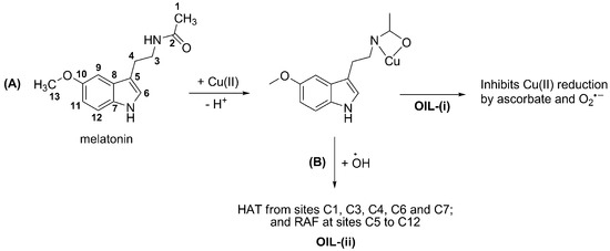 To the best of our knowledge, mechanistic insights regarding the OIL behavior of melatonin have been reported only for its role as OIL-(i), when the redox metal is copper [18]. The most likely complex was identified (Scheme 3A) and proved to inhibit oxidation induced by Cu(II)-ascorbate mixtures, as well as the first step of the MC-HWR. Based on the high reactivity of free melatonin towards •OH (described in Section 3.1) it might be anticipated that this molecule can also be efficient as an OIL-(ii) antioxidant (Scheme 3B). However, further investigations on this subject are still needed.