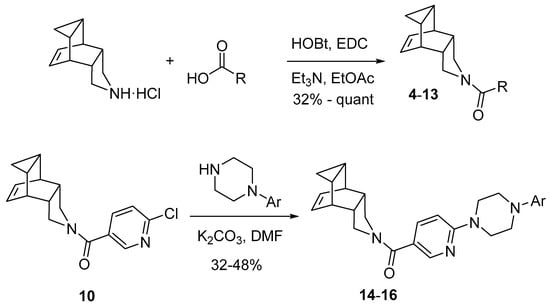 The novel compounds were synthesized according to Scheme 1. From 4-azapentacyclo[5.3.2.02,6.08,10]dodec-11-ene hydrochloride and the corresponding carboxylic acid in combination with 1-hydroxybenzotriazole (HOBt) and N-(3-dimethylaminopropyl)-N’-ethylcarbodiimide (EDC), amides 4–13 were prepared in moderate to excellent yields. For the synthesis of compounds 14–16, the chloropyridinyl-containing analogue 10 was used as starting material in a nucleophilic aromatic substitution with the appropriate N-arylpiperazine delivering the desired compounds in moderate yields (see Section 3.1. and Supplementary Material for details).