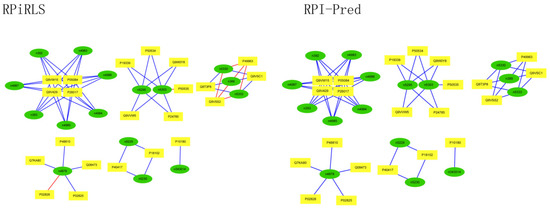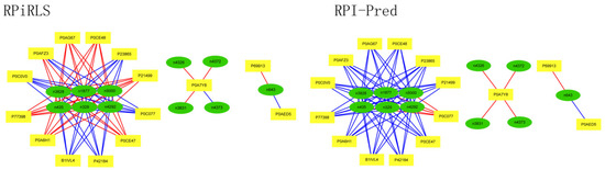 Comparison of the long non-coding RNA-protein interaction networks predicted by the RPiRLS and RPI-Pred methods, for Saccharomyces cerevisiae.