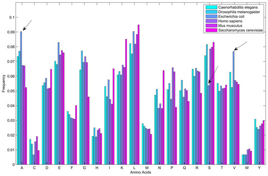 Histogram of the amino acid observing frequencies of lncRNA-binding proteins for six organisms. Escherichia coli has relative higher observing frequencies of amino acids A and V as well as much lower content of amino acid S compared with that of the other five organisms (highlighted by arrows).