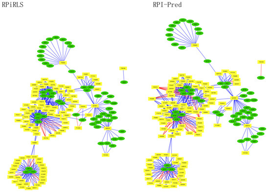 Comparison of the long non-coding RNA-protein interaction networks predicted by the RPiRLS and RPI-Pred methods, for Caenorhabditis elegans. Networks are visualized with Cytoscape v3.4.0. The green (ellipse) and yellow (rectangle) nodes representing lncRNAs and proteins respectively, are connected by edges (solid lines) indicating an interaction between them. The edges colored in blue and red indicate true positive and false negative interactions, respectively.