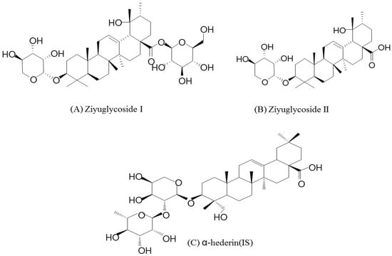 After evaluating the retention time, peak shape, response, and MF, α-hederin was chosen as the IS, which met the requirements of the analysis.