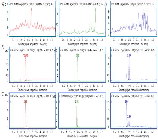 MS parameters were optimized by injecting standard solutions into the MS. For the optimization of ESI conditions for ZGS1, ZGS2, and IS, quadrupole full scans were performed in both positive (+) and negative (−) ion detection modes. Due to the higher sensitivity and a more stable response, the negative mode was more suitable for ZGS1, ZGS2, and the IS. To ascertain precursor ions, ZGS1, ZGS2, and the IS were initially characterized by a tandem mass spectrometry Q1 (full mass spectra) scan. Amproduct scan was used for the selection of suitable product ions, and was used in the MRM mode. Full mass spectra of ZGS1, ZGS2, and the IS, as well as their MS/MS spectra are shown in Figure 2. The MRM transitions of ZGS1, ZGS2, and the IS were m/z 811.4→602.9, m/z 603.5→585.3, and m/z 749.3→471.1, respectively. The fragment and CE were optimized to improve the sensitivity of the detection of the precursor and product ions (Table 1). Other mass spectrometry-related parameters, such as ion spray voltage (ISV), capillary temperature (CT), nebulizer gas (GS1), auxiliary gas (GS2), curtain gas (CUR), and collision gas (CAD) were also optimized to achieve a better response.