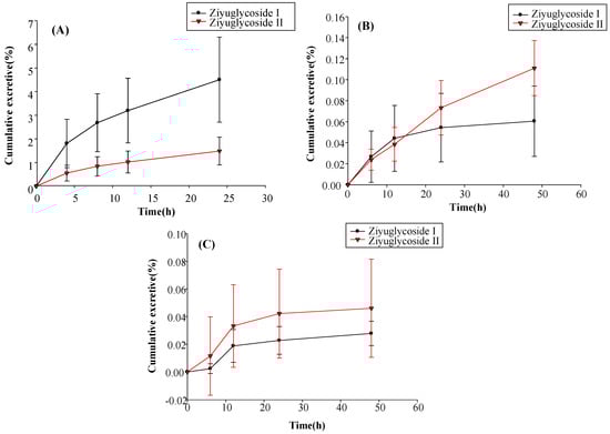 (A) Biliary; (B) urinary; and (C) fecal cumulative excretion profiles of ZGS1 and ZGS2 in rats after subcutaneous injection of ZGS1 (10 mg/kg) (n = 5).