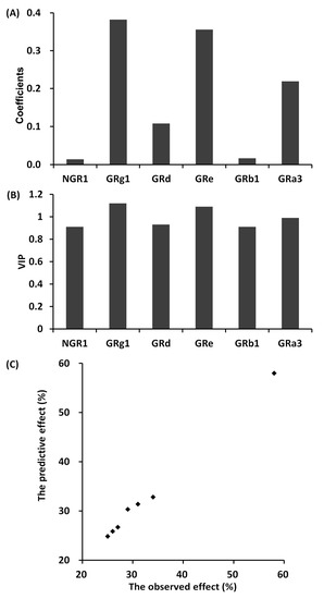 The partial least squares analysis between different individual saponin combinations and anti-platelet aggregation effect in vivo study in example 1. (A) The coefficients values of six saponins (GRb1, GRg1, GRd, NGR1, GRe, and GRa3); (B) The VIP values of six saponins (GRb1, GRg1, GRd, NGR1, GRe, and GRa3); (C) The diagram between the observed anti-platelet aggregation effect and the predictive anti-platelet aggregation effect.