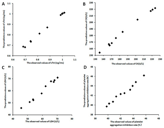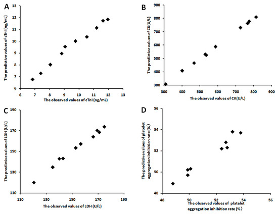 The diagram between the observed effects and the predictive effects in vitro studies in example 2. (A) cTnI; (B) CK; (C) LDH; (D) Platelet aggregation inhibition rate.