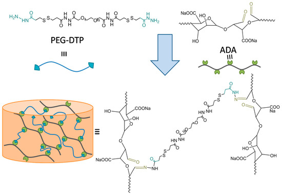 As a natural polymer, sodium alginate is biocompatible and in an oxidizing environment part of its constitutional units can be oxidized to aldehyde groups through ring opening reactions [21]. The sodium alginate dialdehyde (ADA) with numerous aldehyde groups can react with a number of groups, such as amines, to form dynamic covalent bonds [22]. The sodium alginate-based hydrogels, therefore, can be endowed easily with stimuli-responsive properties. As an important crosslinker, 3,3′-dithiobis(propionohydrazide) (DTP) [23] with hydrazide and disulfide functional groups can react with aldehyde groups by Schiff base reactions to from acylhydrazone crosslinks. Since the Schiff base reaction can be quickly conducted at mild conditions, hydrogels are able to form in situ after mixing and injecting the precursor solutions. For example, injectable pH-responsive hollow particle gels utilizing DTP via Schiff base reaction were prepared by Brian R. Saunders [24]. Besides, the dynamic acylhydrazone bonds and disulfide linkages endow the hydrogels with self-healing and stimuli-responsive properties. However, due to the stiffness of the oxidized sodium alginate chain, the hydrogels based on oxidized sodium alginate crosslinked by DTP are brittle. In particular, the oxidized sodium alginate itself will dehydrate in acidic conditions, showing a poor pH responsiveness.