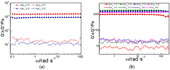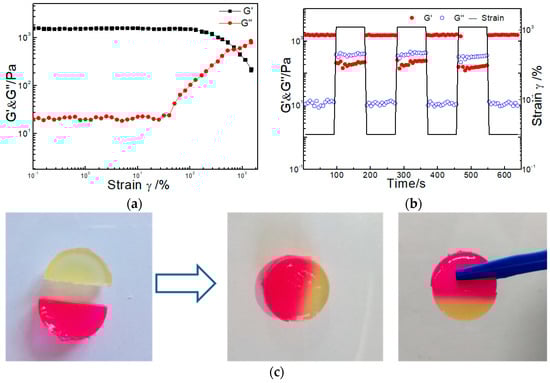 A rheometer (TA Instruments, AR-G2, New Castle, DE, USA) with a platform of 4 cm diameter was used to measure hydrogels’ rheological behavior. The storage moduli G′ and loss moduli G″ were studied at a constant-strain (1%) mode. The frequency range was 0.1–100 rad s−1. The self-healing properties of hydrogels were measured at a constant frequency of 6.283 rad s−1 by a strain step cycled between 1% and 1200% at 25 °C.
